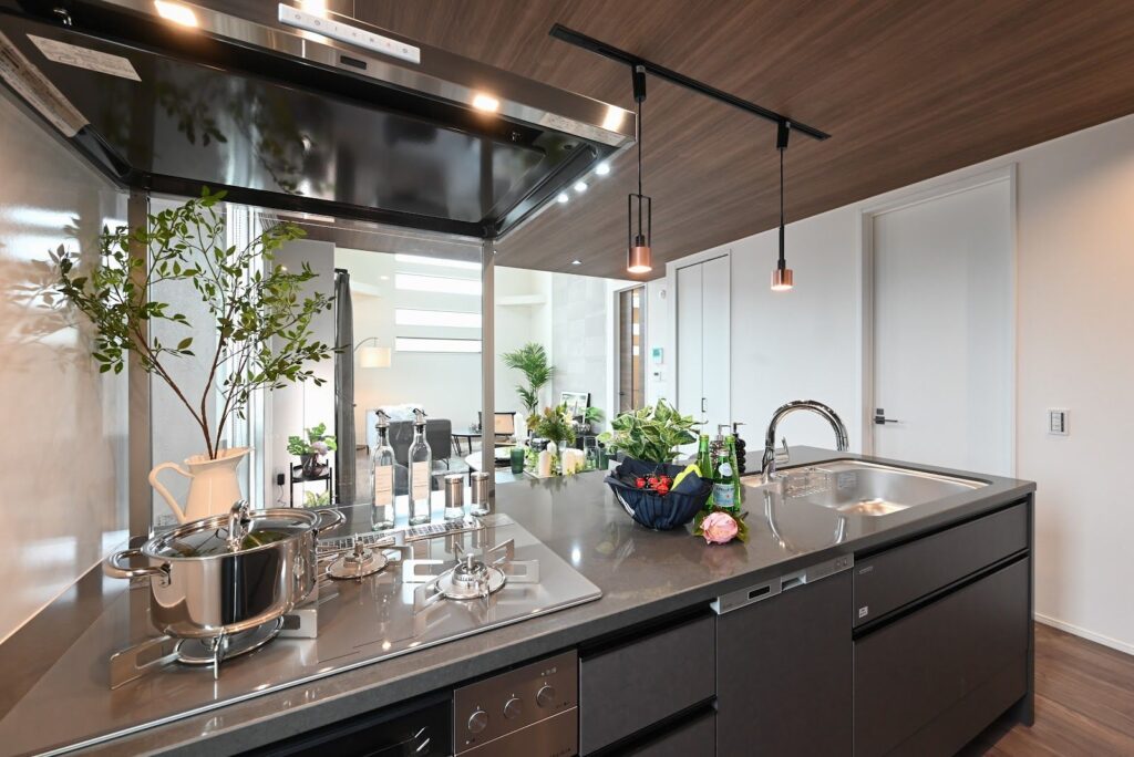 人気のグレーキッチンは、スタイリッシュで上品な印象を与えます。