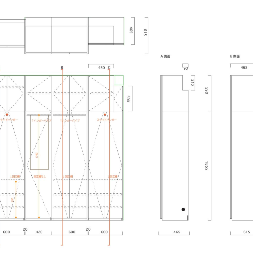 洋服の量を考慮しながら、ハンガーラックや棚の数と配置を決めていきます。
