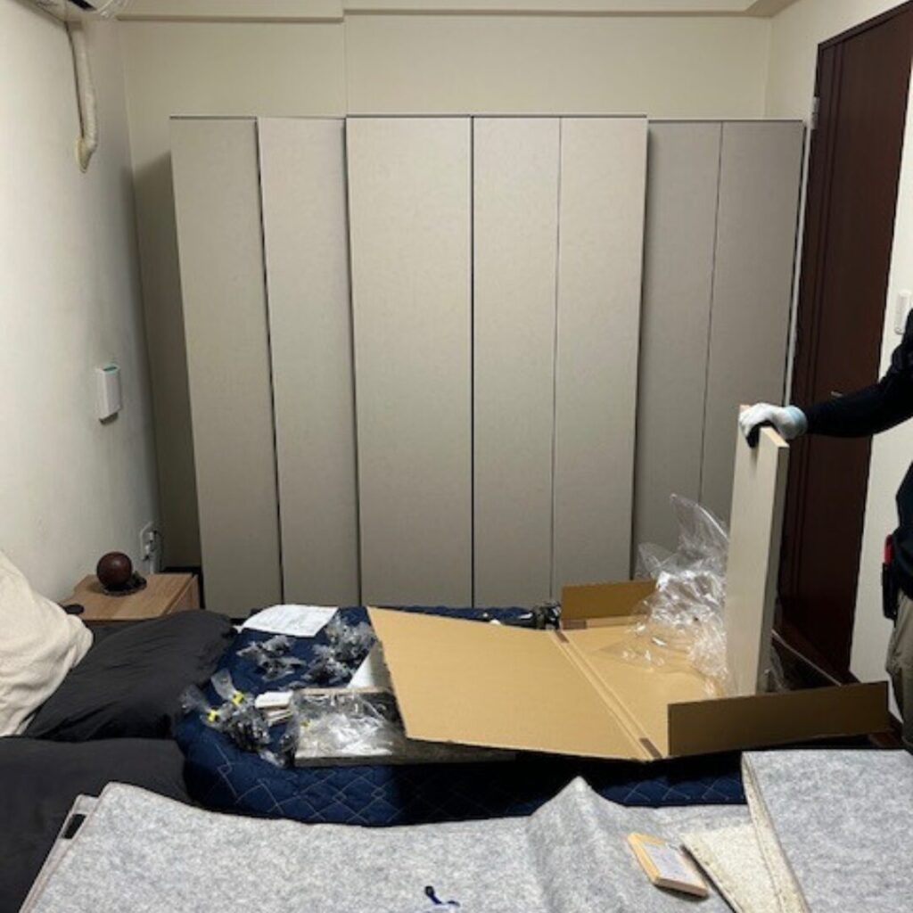 ユニットごとに分けた収納を、床から天井までぴったりと収まるよう慎重に設置していきます。