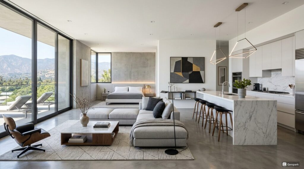 モダン・ラグジュアリー:モノトーン基調・間接照明・金属素材。都心の高層・新築物件に最適。ビジネス利用・カップル向けで高単価が狙えます。