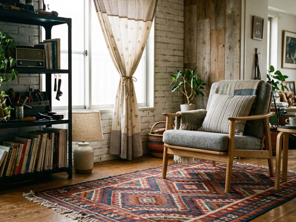 北欧風のチェアとアジアンテイストのラグ、インダストリアルなスチール棚とカントリー調のカーテンが同居する部屋は、個々のアイテムが優れていても全体としてまとまりません。